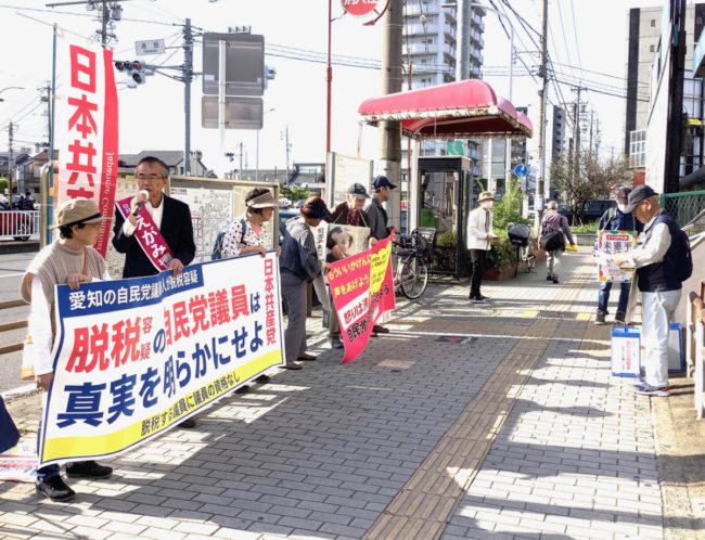 初夏を思わせる4月14日の日曜午後、名古屋市中川区で、憲法講演会、政治資金パーティー裏金疑惑の真相解明を求める宣伝が行われました。
