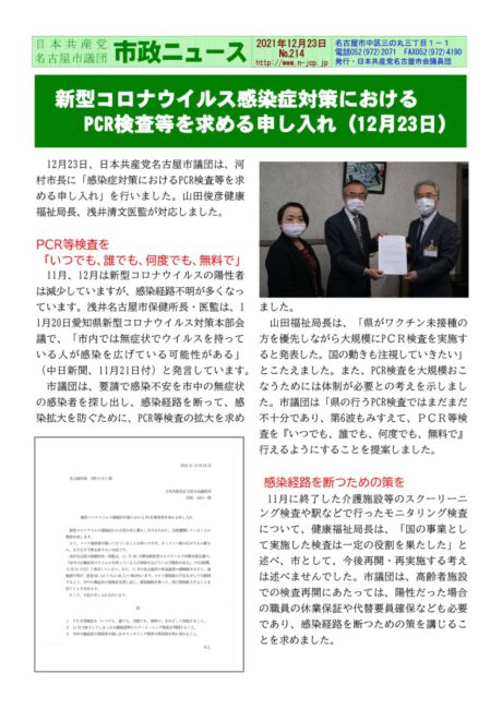 コロナ感染者が減っている今こそ、PCR検査を「いつでも、だれでも、無料で」おこなって、オミクロン株への不安を解消すること求め12月23日、名古屋市長に申し入れを行いました。提出先は、健康福祉局長と保健所長・医監に行いました。