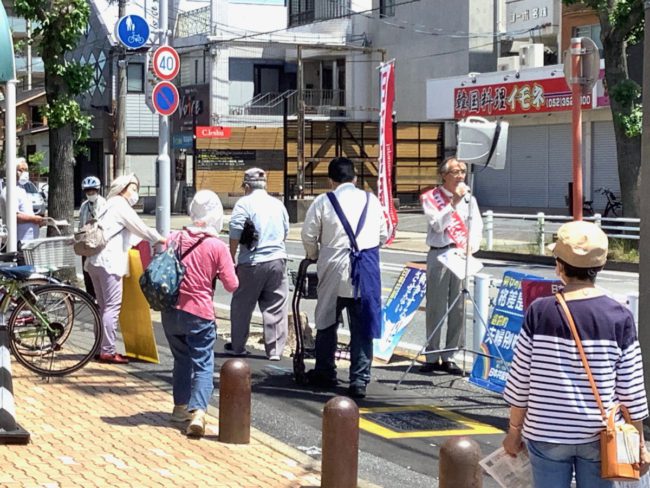 大軍拡・悪法阻止・暮らし守ろうと、5月20(土)、21日(日)に、中川区内の東、まんなんか、西に分けて3か所で宣伝行動。市会議員選挙の報告ののち、公約実現ということで訴えました。